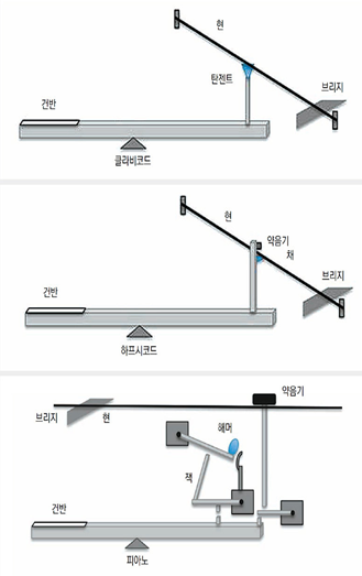 하프시코드는 현악기로서 작동하며, 각 음에 대해 별도의 현이 할당됩니다. 하프시코드는 현의 진동을 누르는 것이 아니라, 키를 눌러 새로운 현의 진동을 일으키는 방식으로 소리를 만듭니다. 다시 말하면, 피아노가 건반을 누르면 해머가 현을 '때려' 소리가 나는 '타건 악기'라면, 하프시코드는 건반을 누르면 플랙트럼이라는 작은 플라스틱이(당시에는 새의 깃털같은 재료를 사용햤으며, 이후 가죽으로 된 고리로 현을 튕김) 현을 뜯어 소리가 나는 '발현악기'입니다.